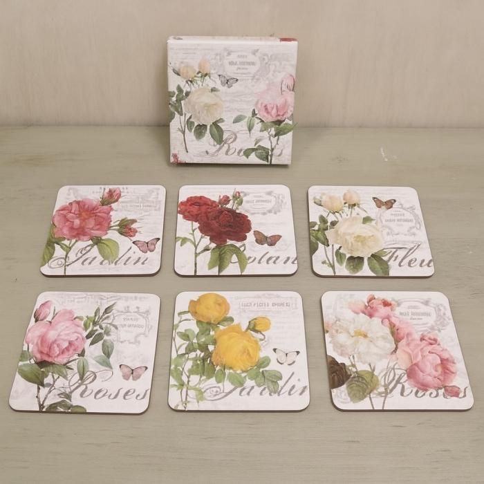 異なる6種類の美しいローズ柄が楽しめるコースターセットです。