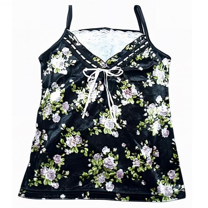 【クリアランス】薔薇模様のベロアキャミソール ブラック Mサイズ レース リボン バラ 薔薇