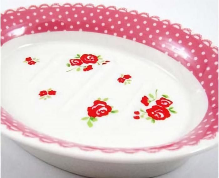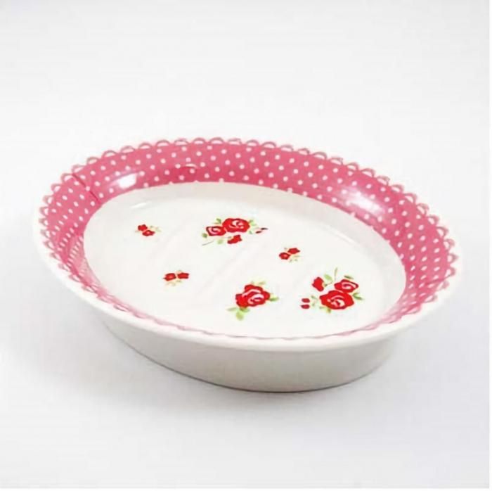 可憐な薔薇とドットレースの縁取りがキュートな磁器製ソープディッシュです。