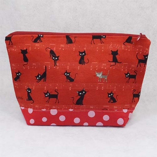 ハンドメイド 猫&水玉柄立体ポーチ 22cm K ネコ キャット