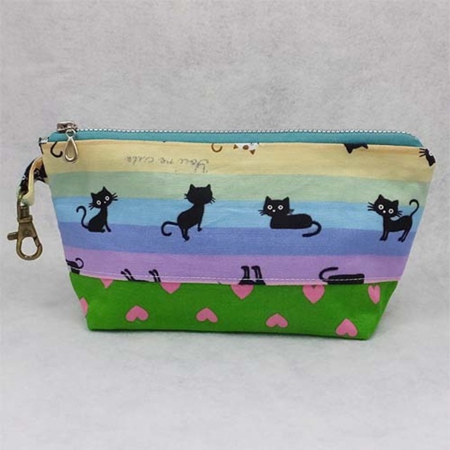 ハンドメイド 猫&ハート柄立体ポーチ 20cm K ネコ キャット