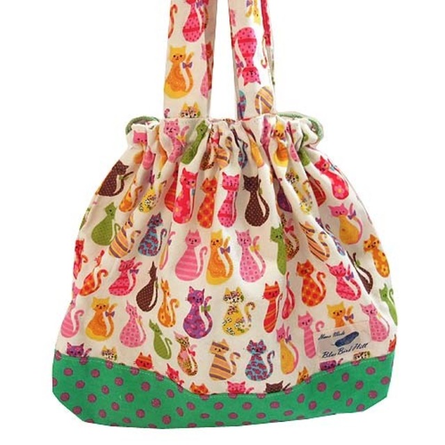 ハンドメイドブランド「青い鳥の丘」の巾着バッグです。 猫柄と水玉模様のコンビがかわいいです。 接着芯は使っていないので、柔らかな素材感です。 内側にはポケットが二つ付いています。 サイズ:約高24×幅35×マチ8cm、持ち手の長さ:約40cm 【メール便可】