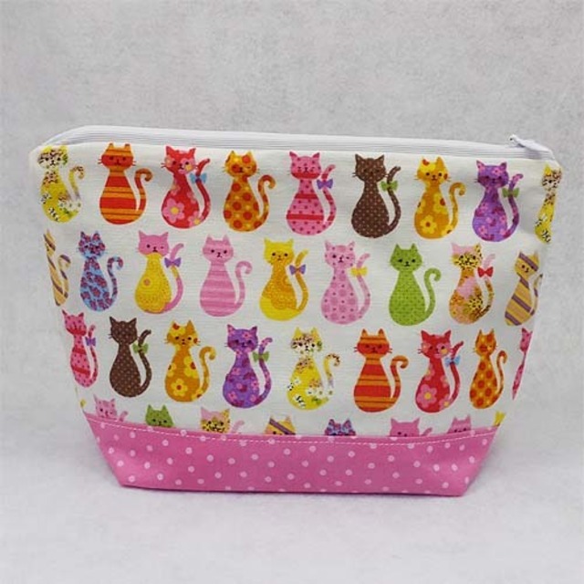 ハンドメイド 猫&水玉柄立体ポーチ 22cm L ネコ キャット