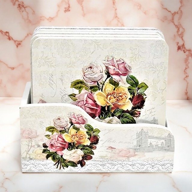 異なる6種類の美しいローズ柄が楽しめるコースターセットです。 お茶やコーヒーの時間が華やかに彩られること間違いなし! 裏面はコルク仕様なので、テーブルを傷つけずに使用できます。 同じ絵柄のBOX入りなので、ギフトにも最適です。 サイズ:サイズ:W10×H10.5cm 耐熱温度:100℃