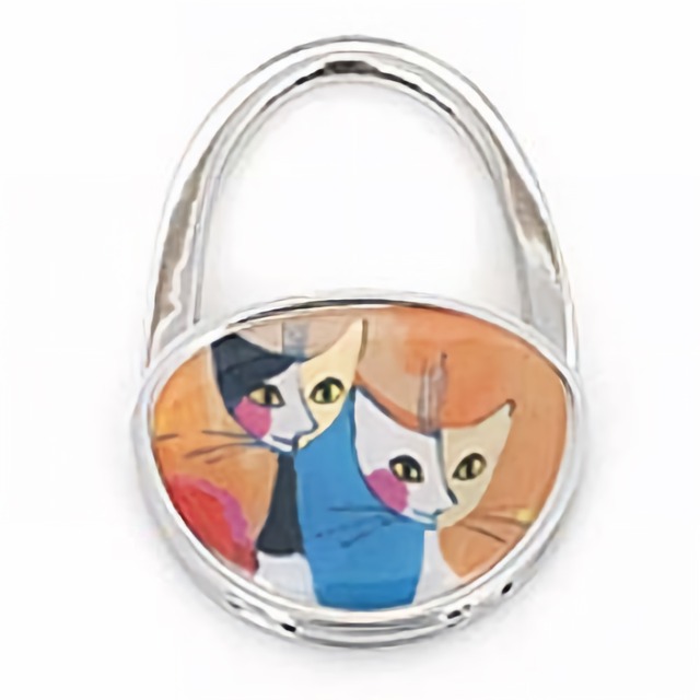 狭いお店やカフェなどで、バッグの置き場が困る場所で大活躍! 普段はバッグチャームとしても使えます。 アート風な猫ちゃんのイラストが素敵。 サイズ:H約6.3cm×W約4.5cm 素材:亞鉛合金+ゴム 【メール便可】