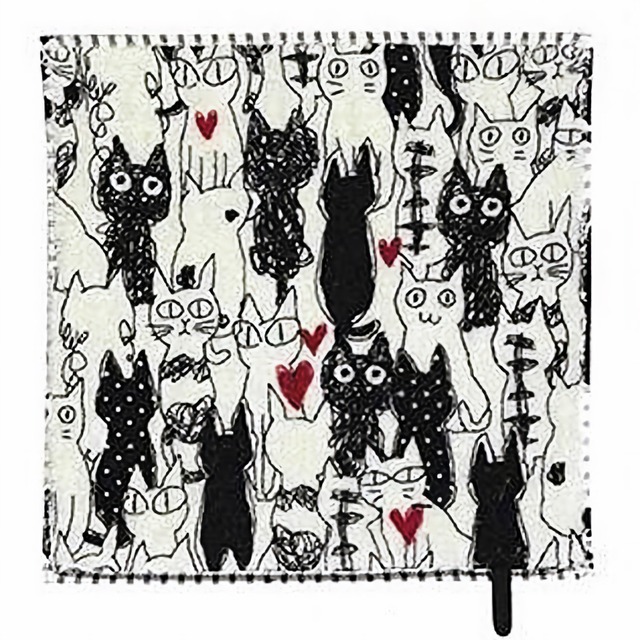 ジャガードのドット柄と黒猫のアップリケがかわいくマッチ。 飛び出したしっぽがリング状なので、引っ掛けられて便利です。 サイズ:約23.5cm×23.5cm 素材:ジャガード織り・無撚糸使用 【メール便可】