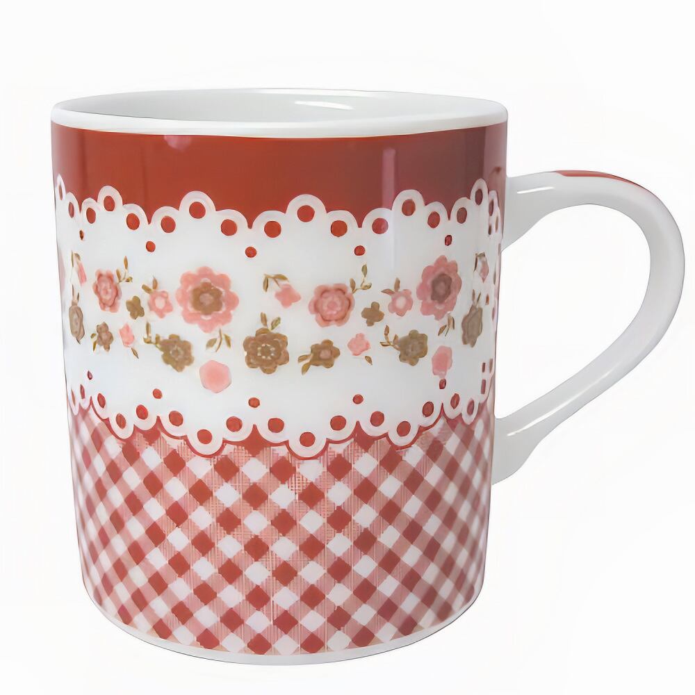 繊細なレースとフラワーデザイン、チェック柄が特徴的なこのマグカップは、どんなシーンでも心を和ませてくれるアイテムです。