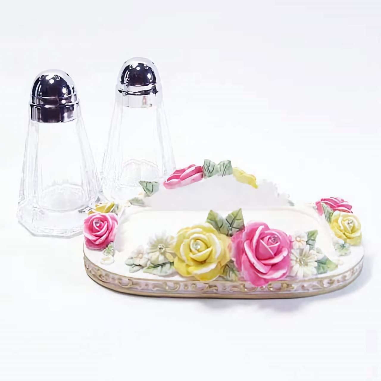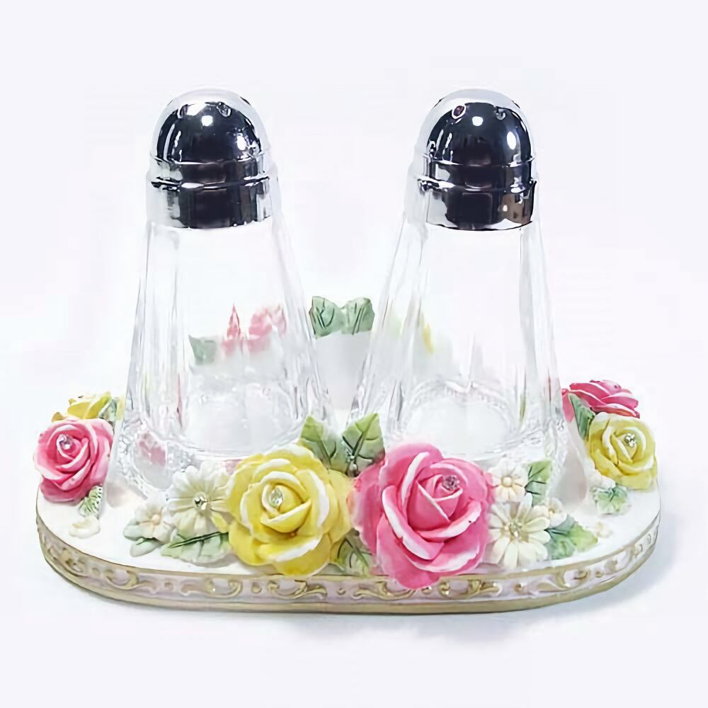 美しいピンクとイエローの組み合わせが特徴のローズモチーフソルト&ペッパーセット。