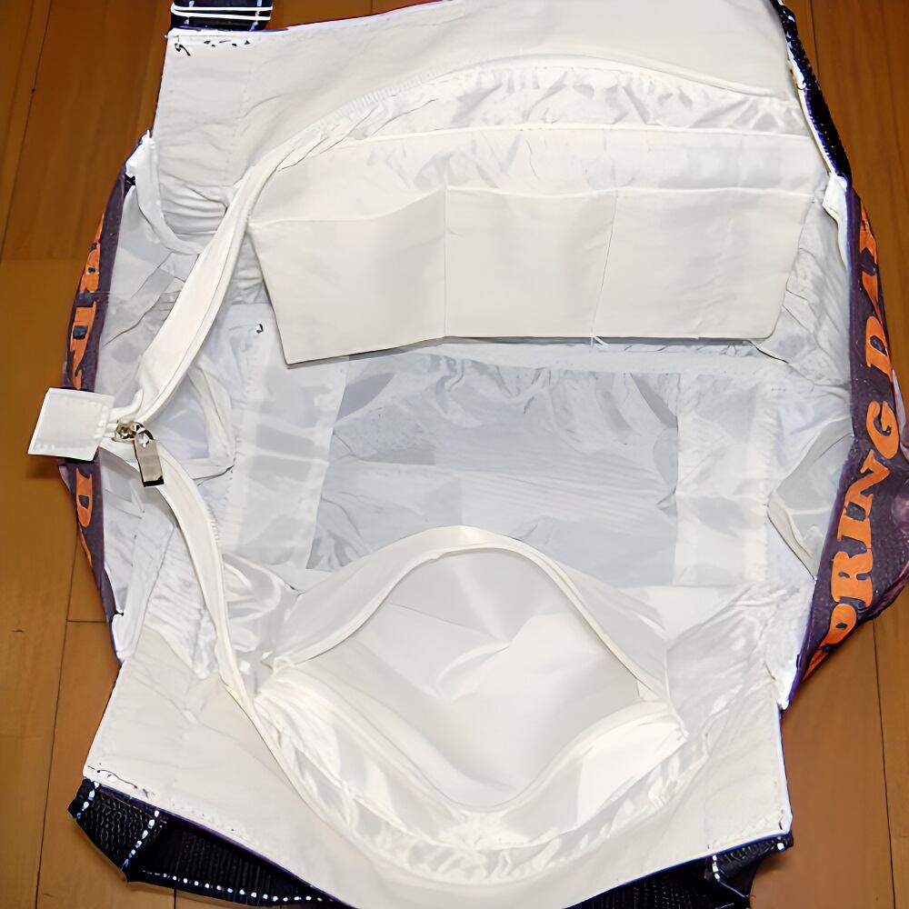 内側には小物を入れられるポケットとファスナーポケット、両サイドにはペットボトルなどが立てられるベルトがついています。