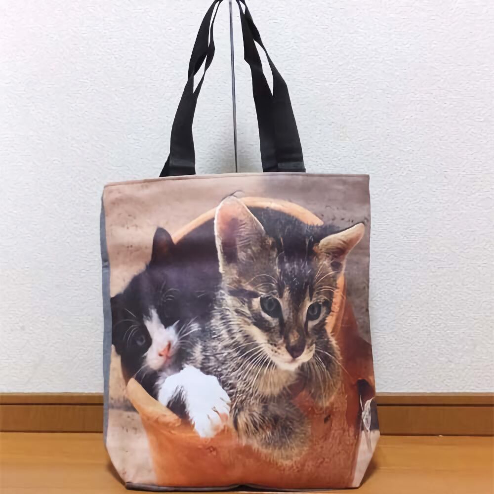 あどけない子猫の写真プリントがかわいらしいバッグです。