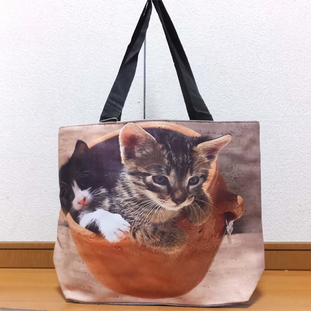 あどけない子猫の写真プリントがかわいらしいバッグです。