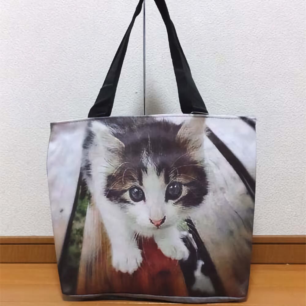 あどけない子猫の写真プリントがかわいらしいバッグです。