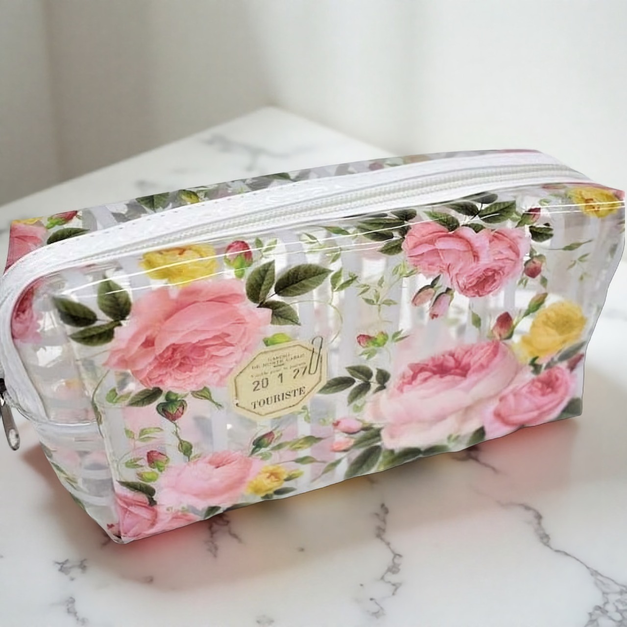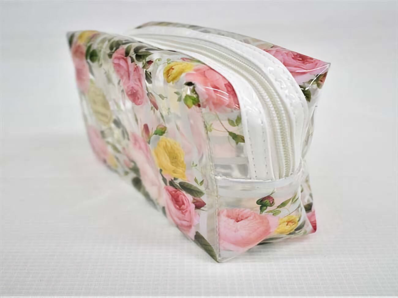 美しいバラのデザインが施されたシックなクリアポーチ。