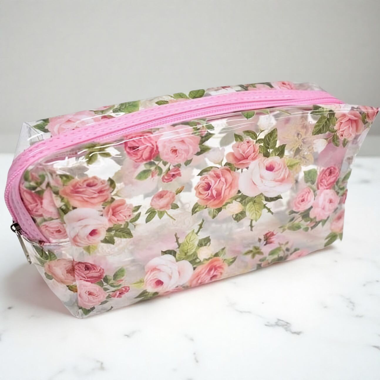 美しいバラのデザインが施されたシックなクリアポーチ。