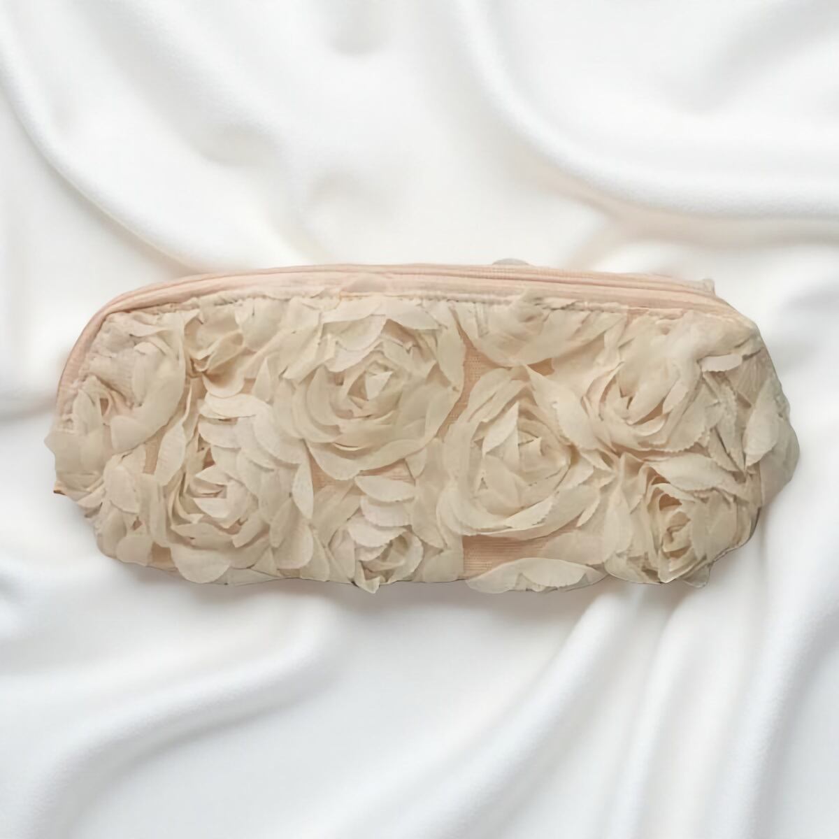 表面全体に淡いピンクの薔薇がちりばめられたエレガントなポーチ。