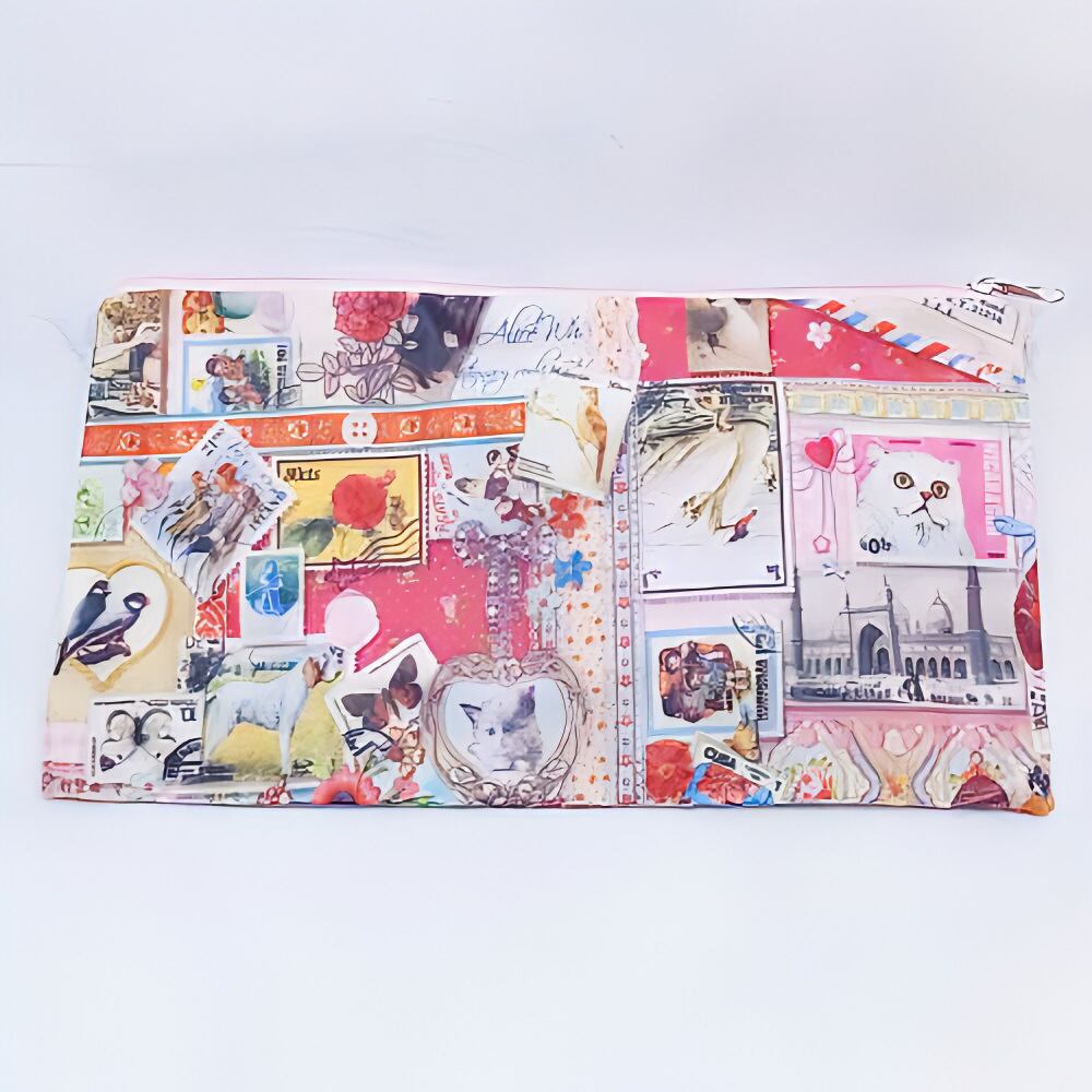 可愛らしいスタンプとコラージュデザインが特徴で、あなたの持ち物をおしゃれに演出します。