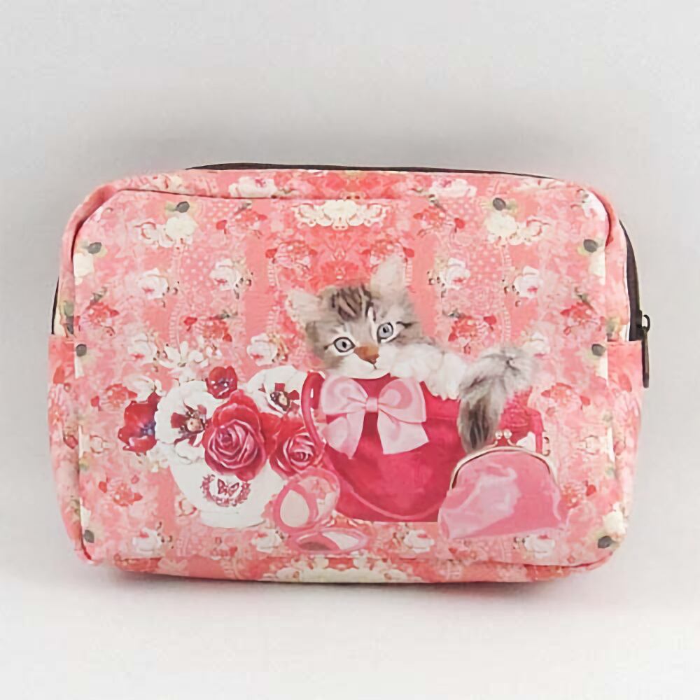愛らしいネコのプリントがロマンティックなスクエア型ポーチです。