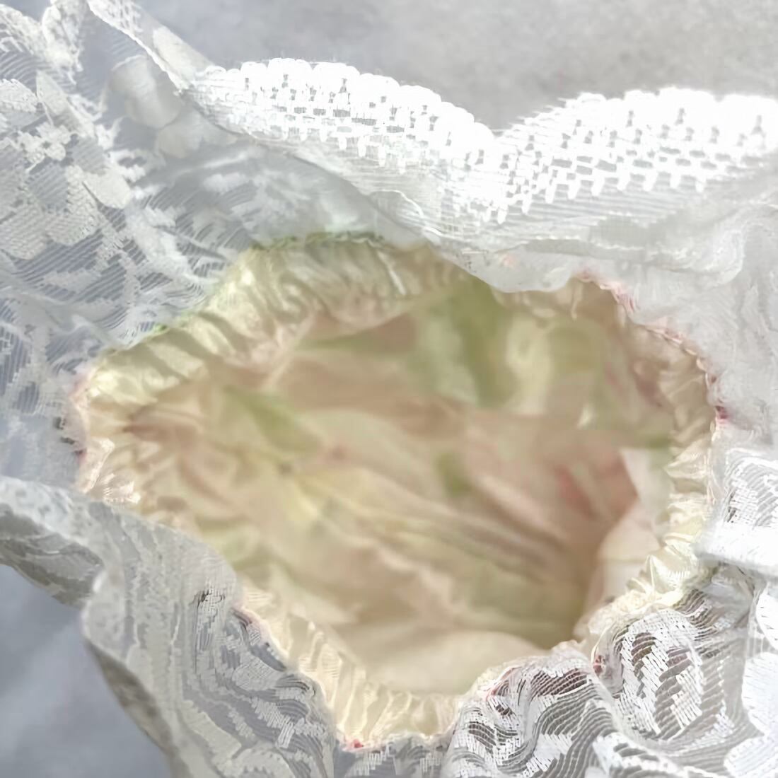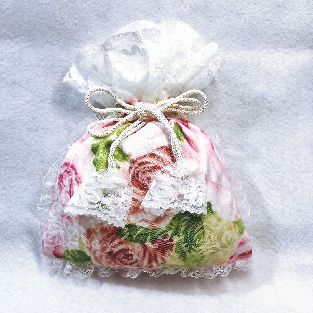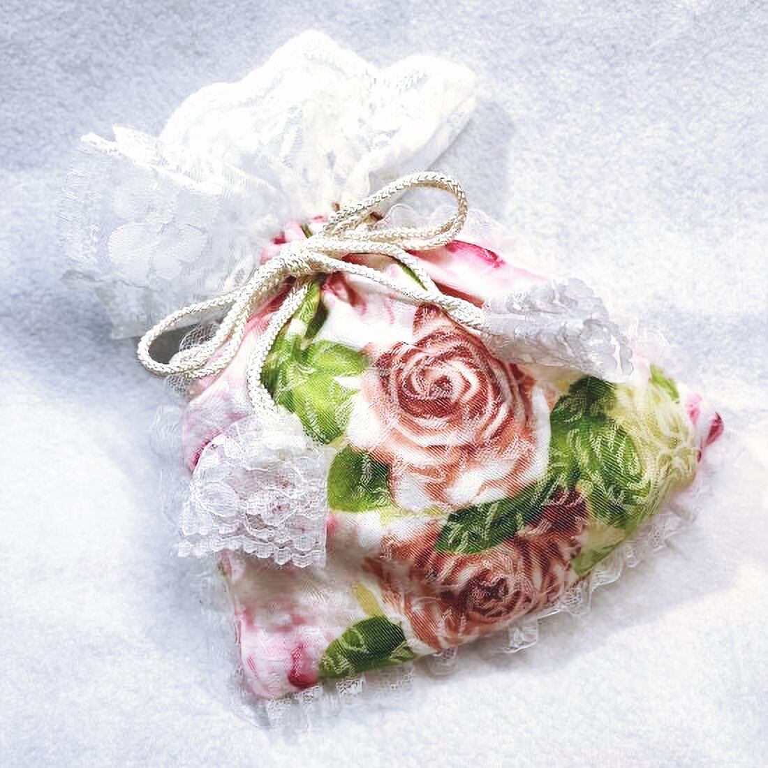 大輪の薔薇がプリントされたジャカード地に清楚なラッセルレースがマッチしたオシャレな巾着です。
