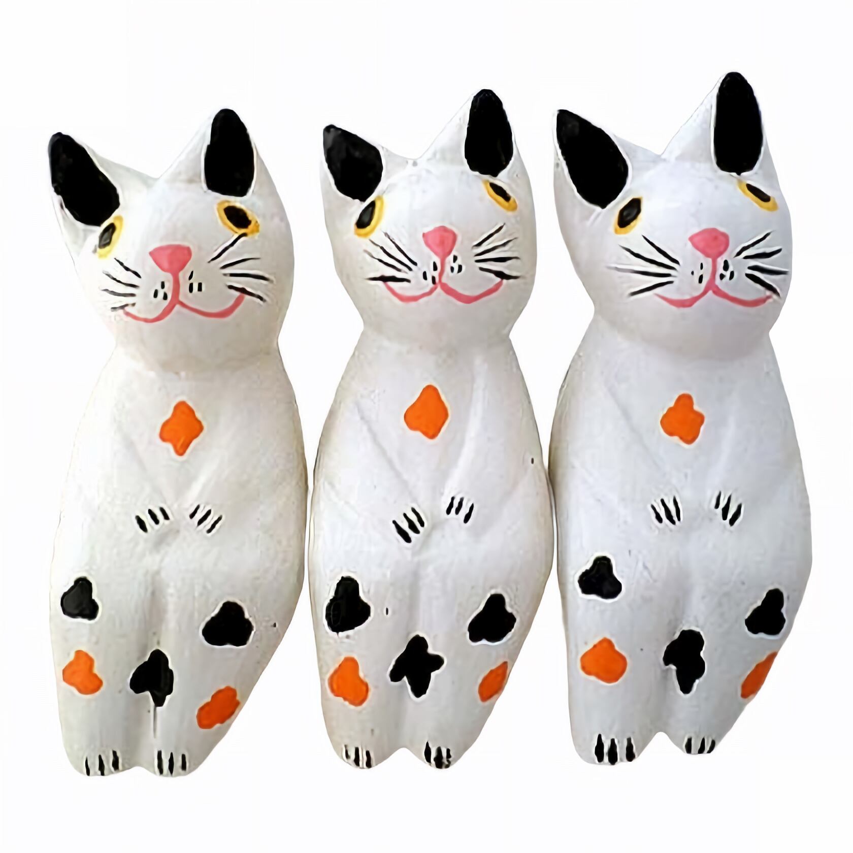 猫の木彫り人形 お座り猫トリオ 白猫 ネコ キャット 置物
