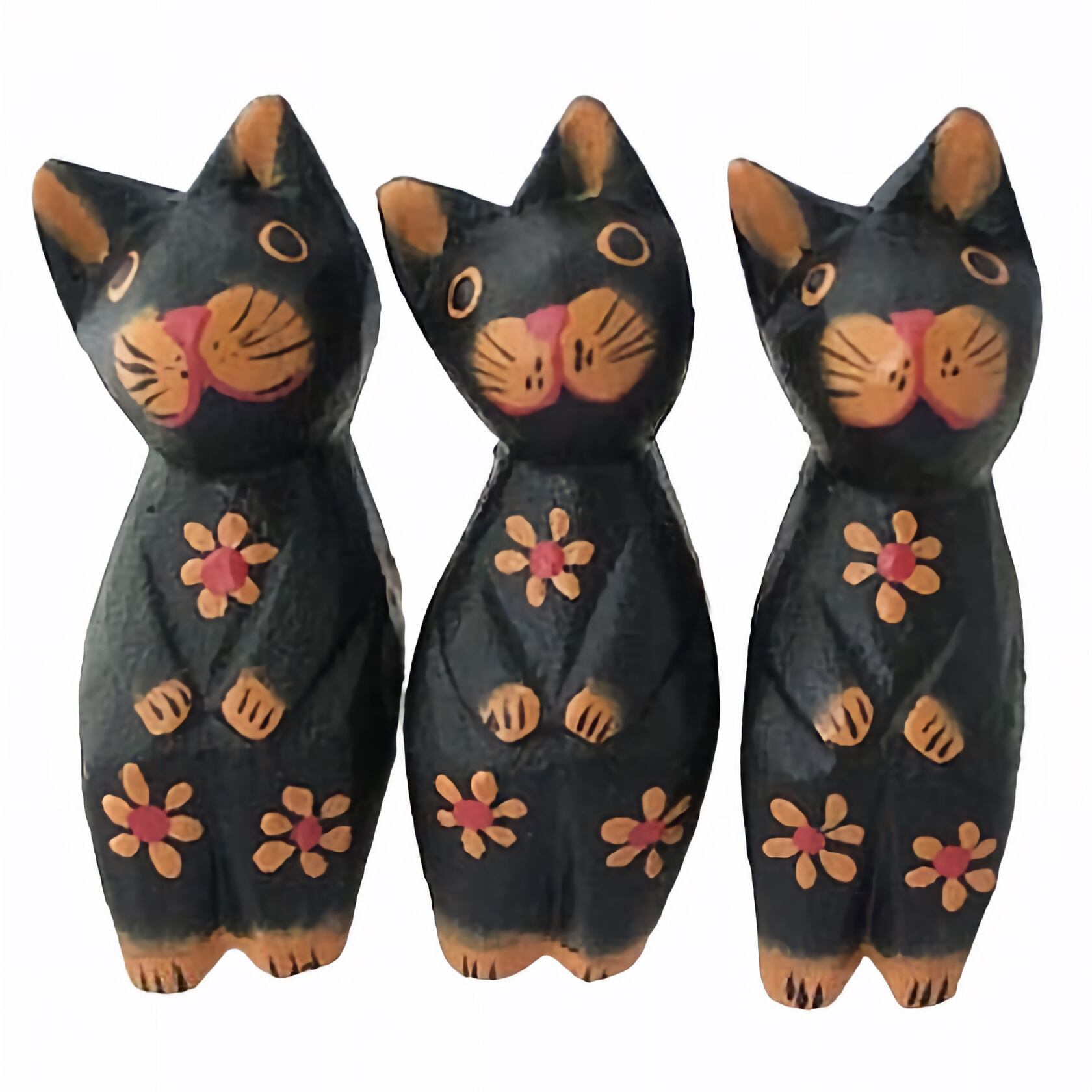 猫の木彫り人形 お座り猫トリオ 黒猫 ネコ キャット 置物