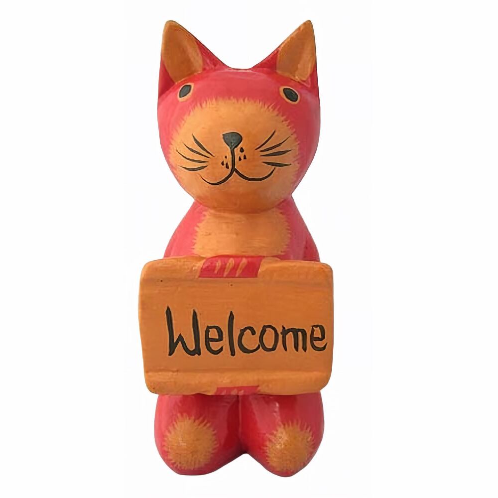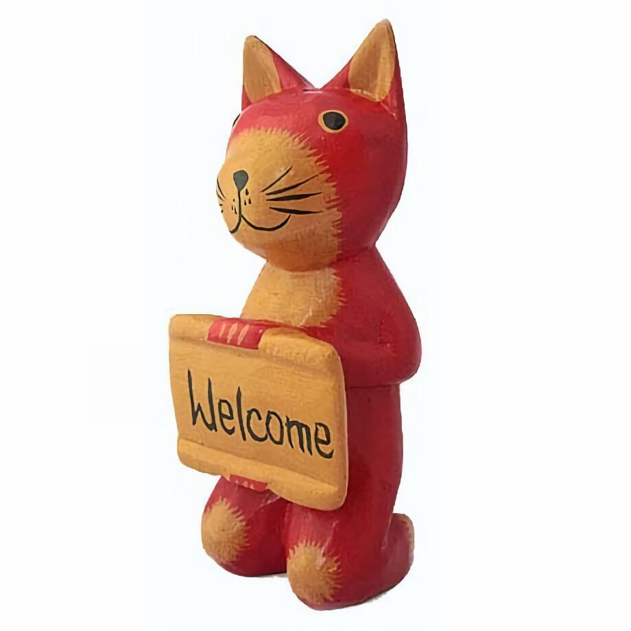 猫の木彫り人形 ウェルカムボード持ち猫 赤 ネコ キャット 置物