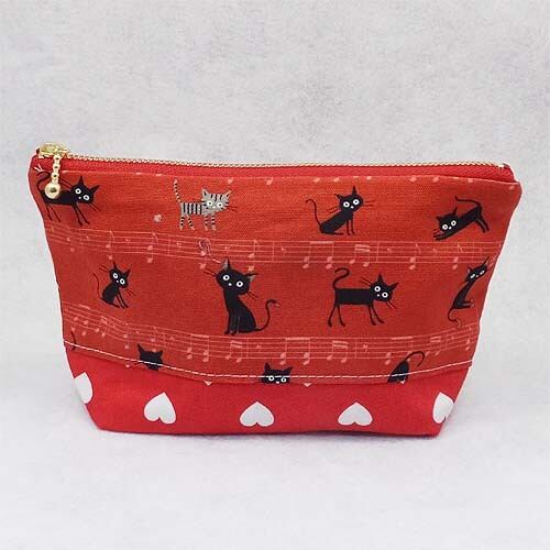 ハンドメイド 猫&ハート柄立体ポーチ 18cm L ネコ キャット