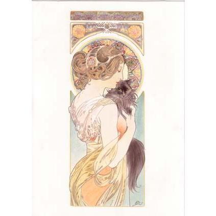 ポストカードNo.225・「黒猫と桜草」 目羅健嗣 猫イラスト